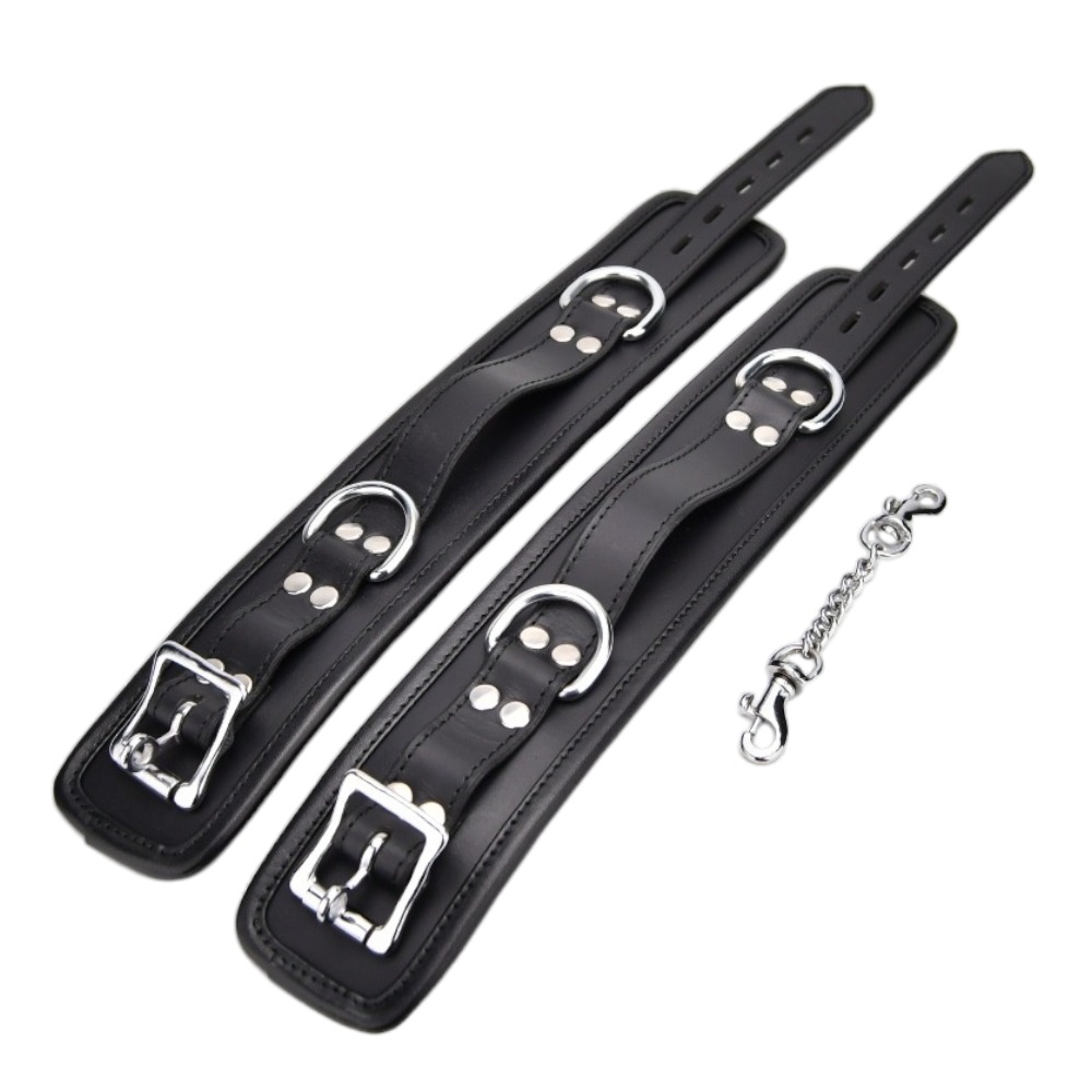 Set the scene and establish the tone of exquisite pleasure and pain by restraining your sub with these exclusively high quality, durable leather ankle cuffs. Soft and padded for comfort and safety but tight and sturdy for advanced and lengthy bondage play, these cuffs will leave you truly Bound. Comes with a detachable double trigger hook chain connecting one set of D-rings on each cuff, further restricting the sub’s movement if desired. You can also use the chain and a total of 4 D-rings to attach other bondage items if you want to introduce further variety into your BDSM session. The buckle system is lockable with a padlock through the prong so you can have complete control over the extent of the limitations you set. Treat your sub to these high quality cuffs, they’ll beg to be tied up just to feel the luxurious leather tight around their ankles, smell the genuine, high quality leather and enjoy the inescapability of these premium restraints. Add a professional look and feel to your BDSM scenes with our exquisite bondage range, BOUND. Check out and complete your BOUND collection with our exclusive nubuck leather wrist cuffs, collar, flogger, paddle, solid ball gag, 4-way hogtie, leash, blindfold and riding crop. BOUND Padlock and Double Trigger Clip also available to use with this range.