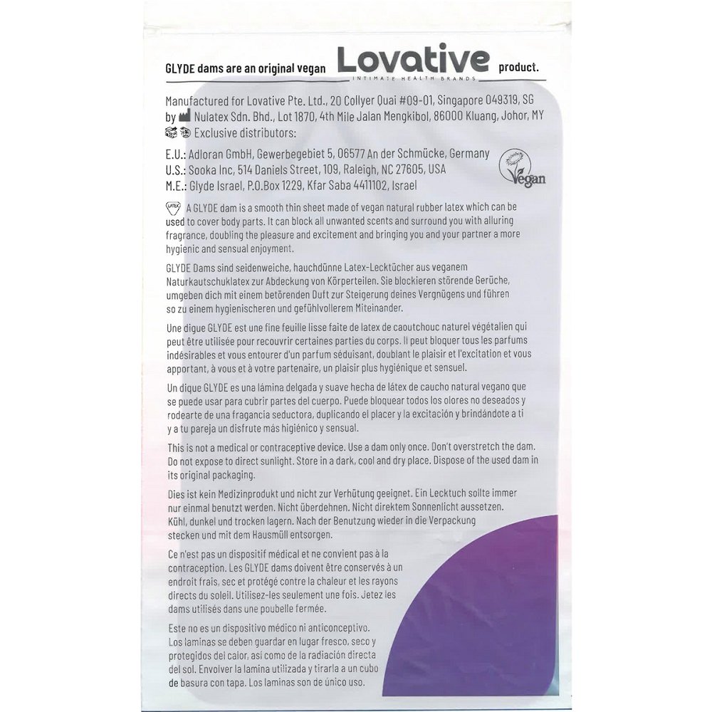 Glyde Dams are a smooth thin sheet made of vegan natural rubber latex which can be used to cover body parts. It can block all unwanted scents and surround you with alluring fragrance, doubling the pleasure and excitement and bringing you and your partner a more hygienic and sensual enjoyment. Mixed Flavour pack includes Vanilla, Strawberry, Wildberry and Cola.